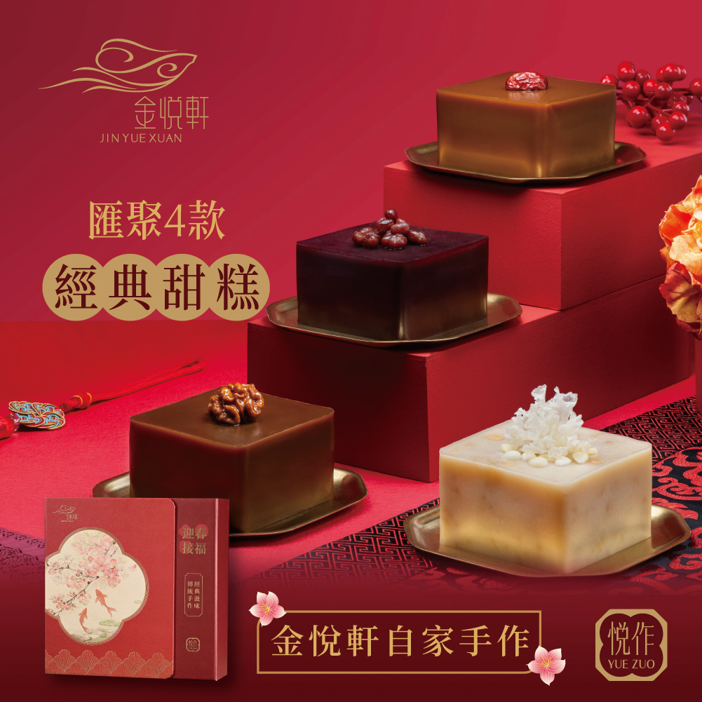 內含核桃棗蓉年糕、鴻運發財年糕、紅豆紫米年糕、杏汁銀耳年糕四款不同口味,款款都是自家手工製造,風味盡享。